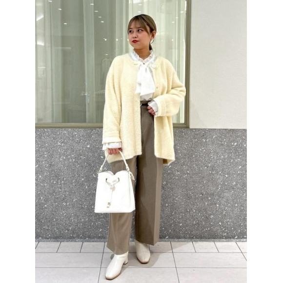 在羊毛衫中,虽然是在办公室也能穿的搭配,但是拿着毛针织大衣和心形切割包,就变成了可爱的搭配!